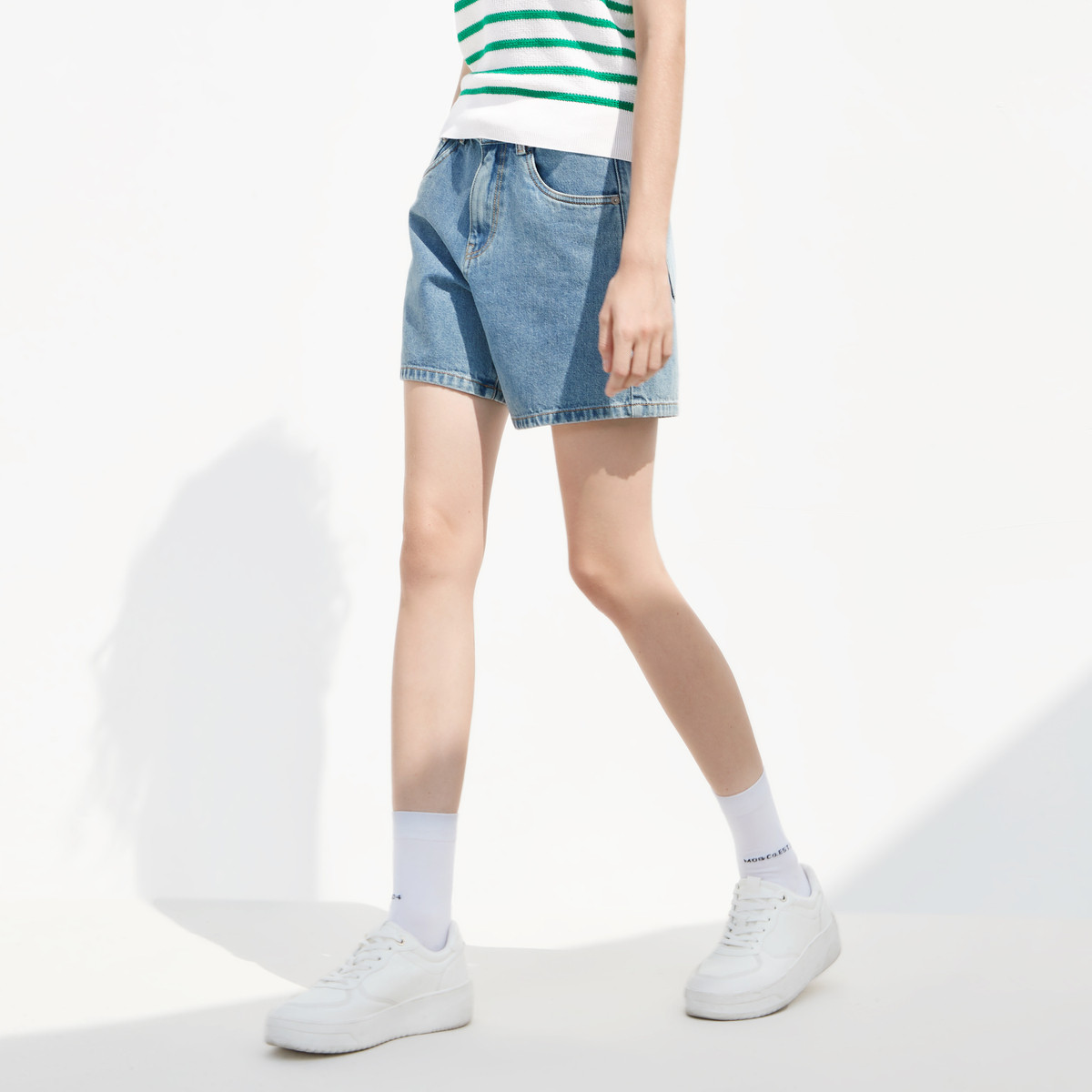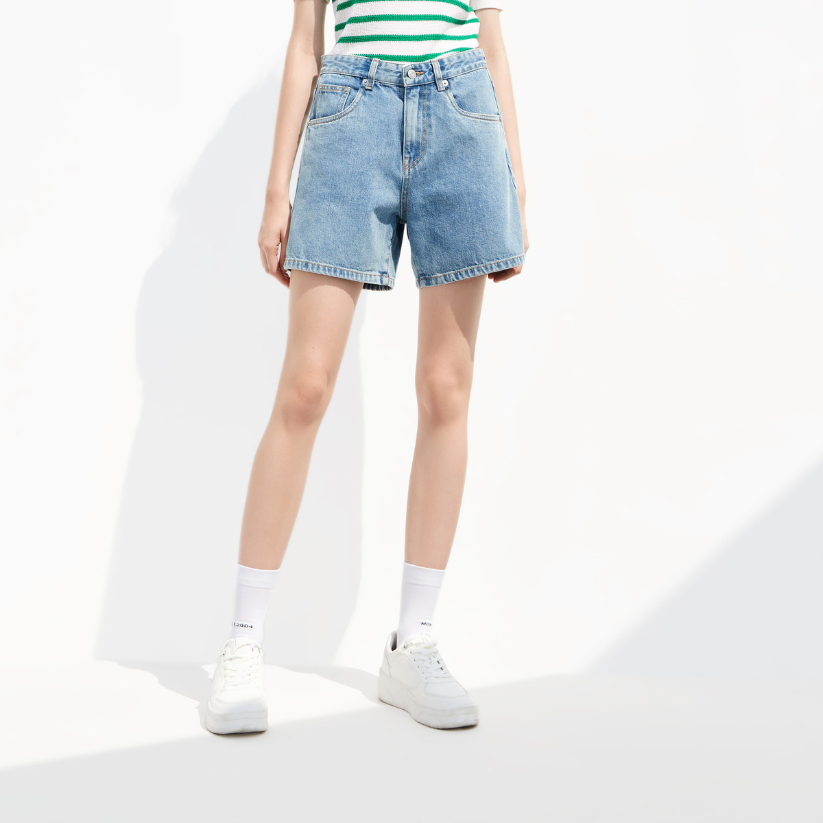 High-rise mid-length denim shorts with rolled hem, 5-pocket styling, zip fly and 2-button closure.