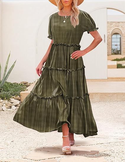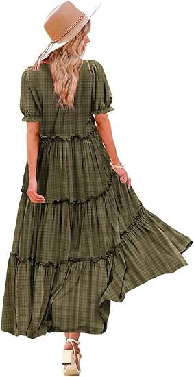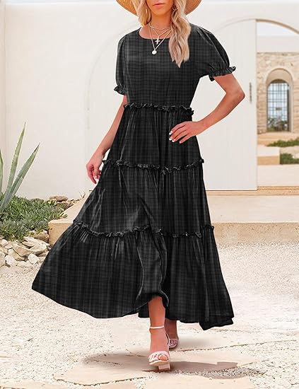 Bubble sleeves add a cute touch while hiding larger arms. Attracting attention, the layered hem features three layers of ruffled edges, flowing like waves, creating a romantic and dreamy atmosphere. Swinging the hem naturally falls on the ankle. Every move you make exudes a stunning feminine atmosphere.