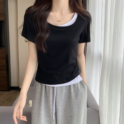 Short sleeve, solid color, basic type, ribbed, crop length, slim fitting, pull on closure