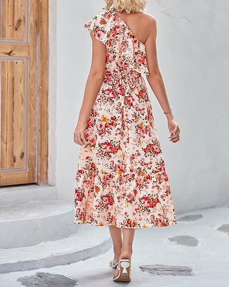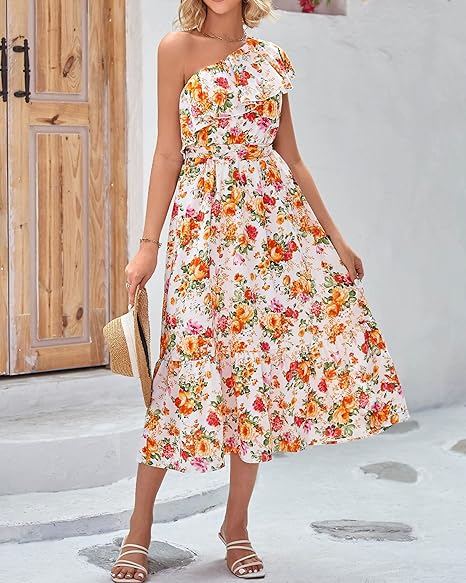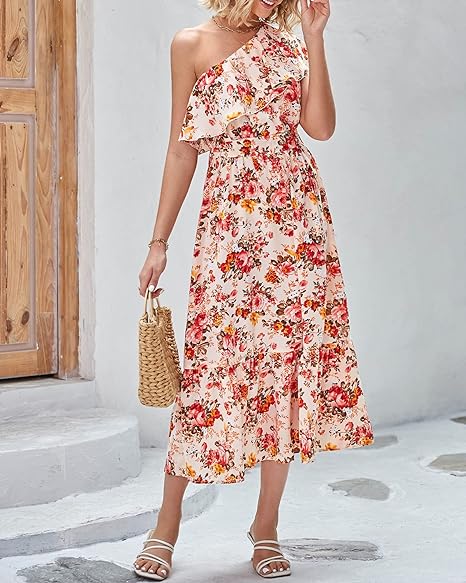 Women's Sleeveless Fashion Dress: Asymmetric neckline, moderately elastic hem, with pleated edges to ensure beautiful neckline. The cute floral print all over the body has extra highlights as it makes this garment an absolutely unique piece