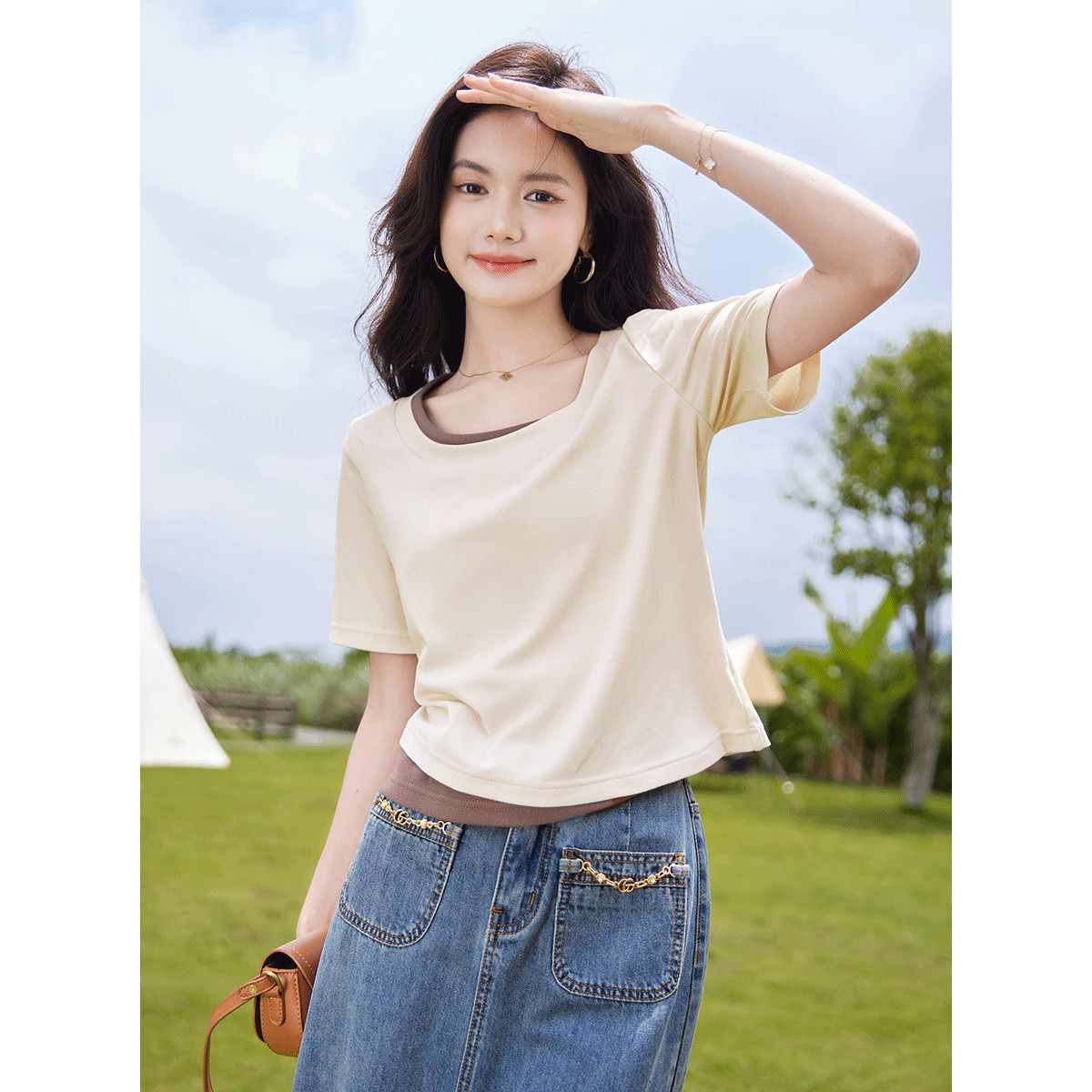 Stylish design, irregular U-neck short-sleeved top, elegant T-shirt